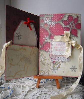 Не за горами Новый год и уже пора начинать готовится))) Чудесный новогодний марафон открыток устраивает LAE. К сожалению о нём я узнала уже после того как он стартовал, но так как присоединится можно на любом этапе, то я начну сразу с третьего задания. Вот такая у меня вышла открыточка.